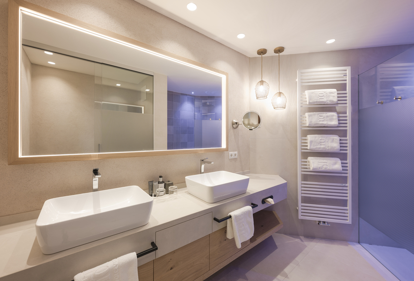 - modernes Badezimmer mit großer Walk-In-Dusche und Doppelwaschbecken
